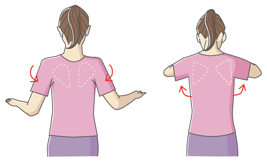 2. 背中が凝っている場合・・・巻き肩を正す 2つの肩甲骨を背骨に近づけるように、背中を動かします。巻き肩の人は肩甲骨が背骨から離れていっています。