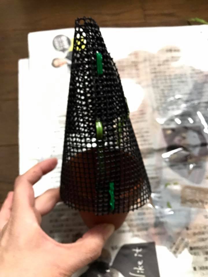 写真のように鉢底ネットをツリーの形に丸め、ビニールタイで適宜固定します。