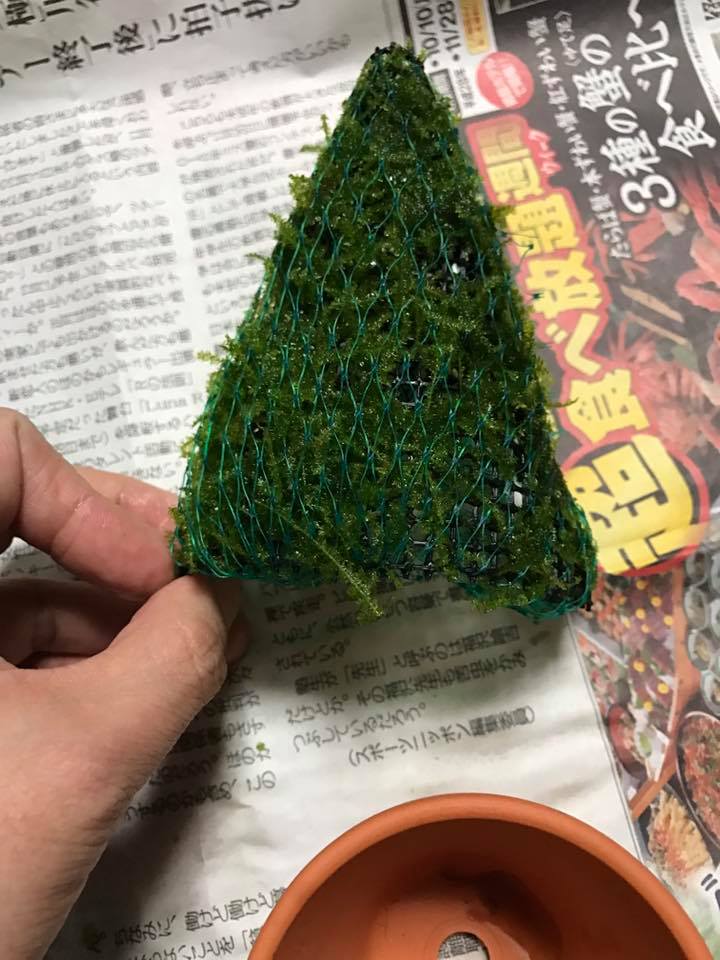 ツリー型の鉢底ネットの上に、短く切ったモスをまんべんなく載せ、その上からネットをかけて、ビニールタイで固定します。