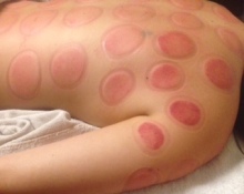 肩や背中に中国の伝統的な器具・吸い玉をつけてしばらく置くと、