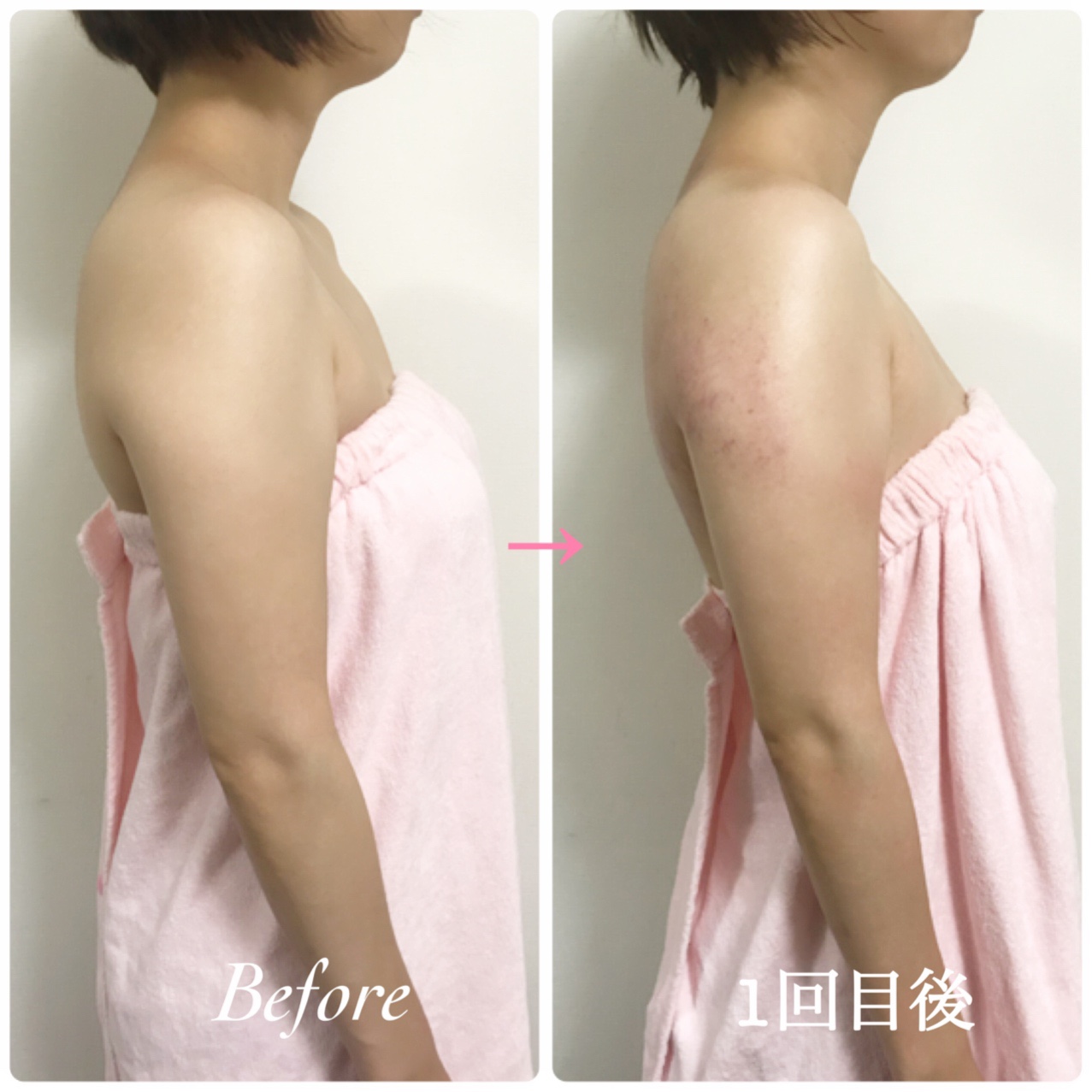 背中が薄くなり、肩が後ろに下がりました(腕の赤みはセルライト除去による一時的なもの)。