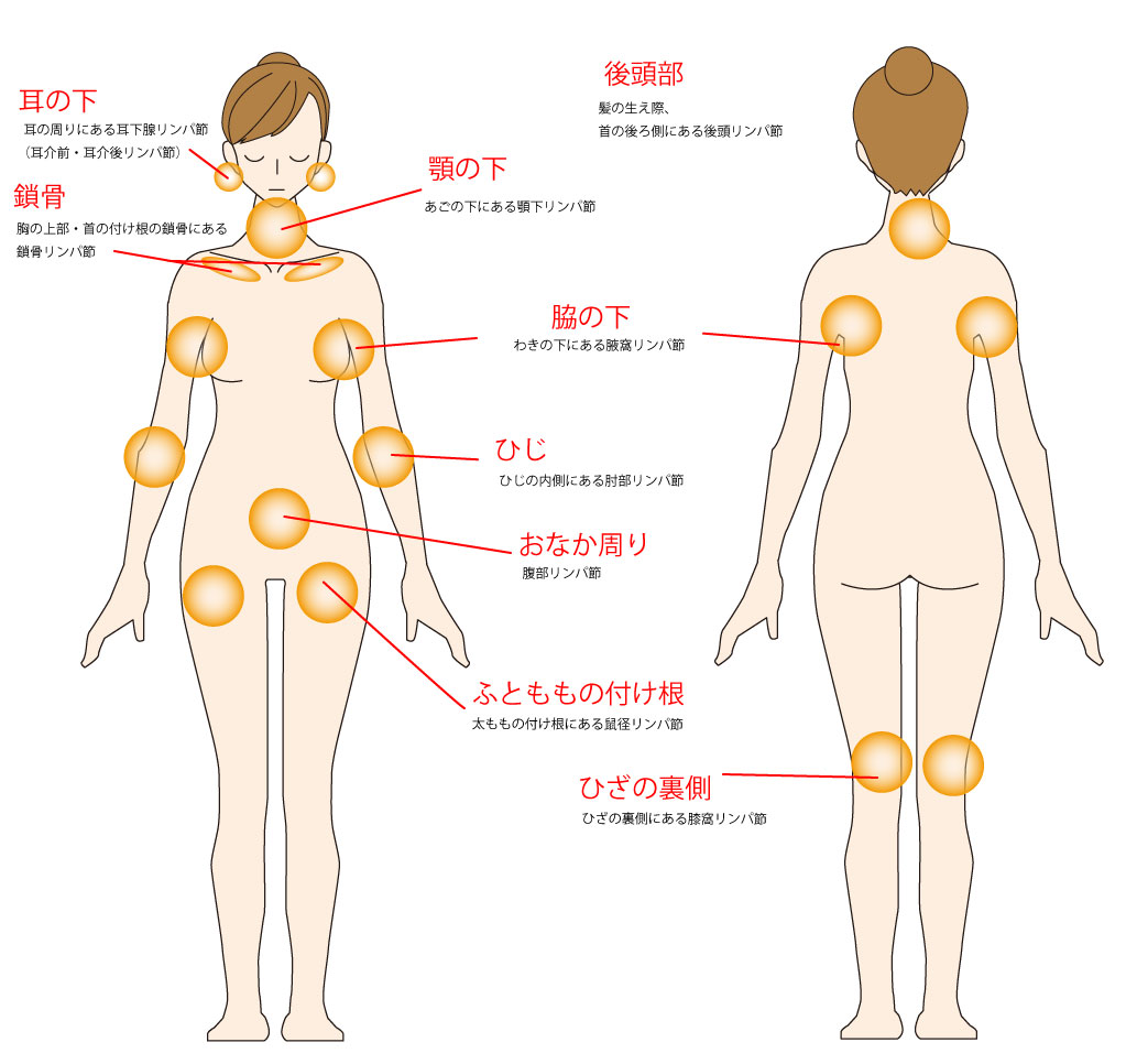 お体には鎖骨のリンパ節をはじめとして、600個ほどのリンパ節があります。 その中でも特に重要なリンパ節が集まっている部分が図の赤丸の部分です。