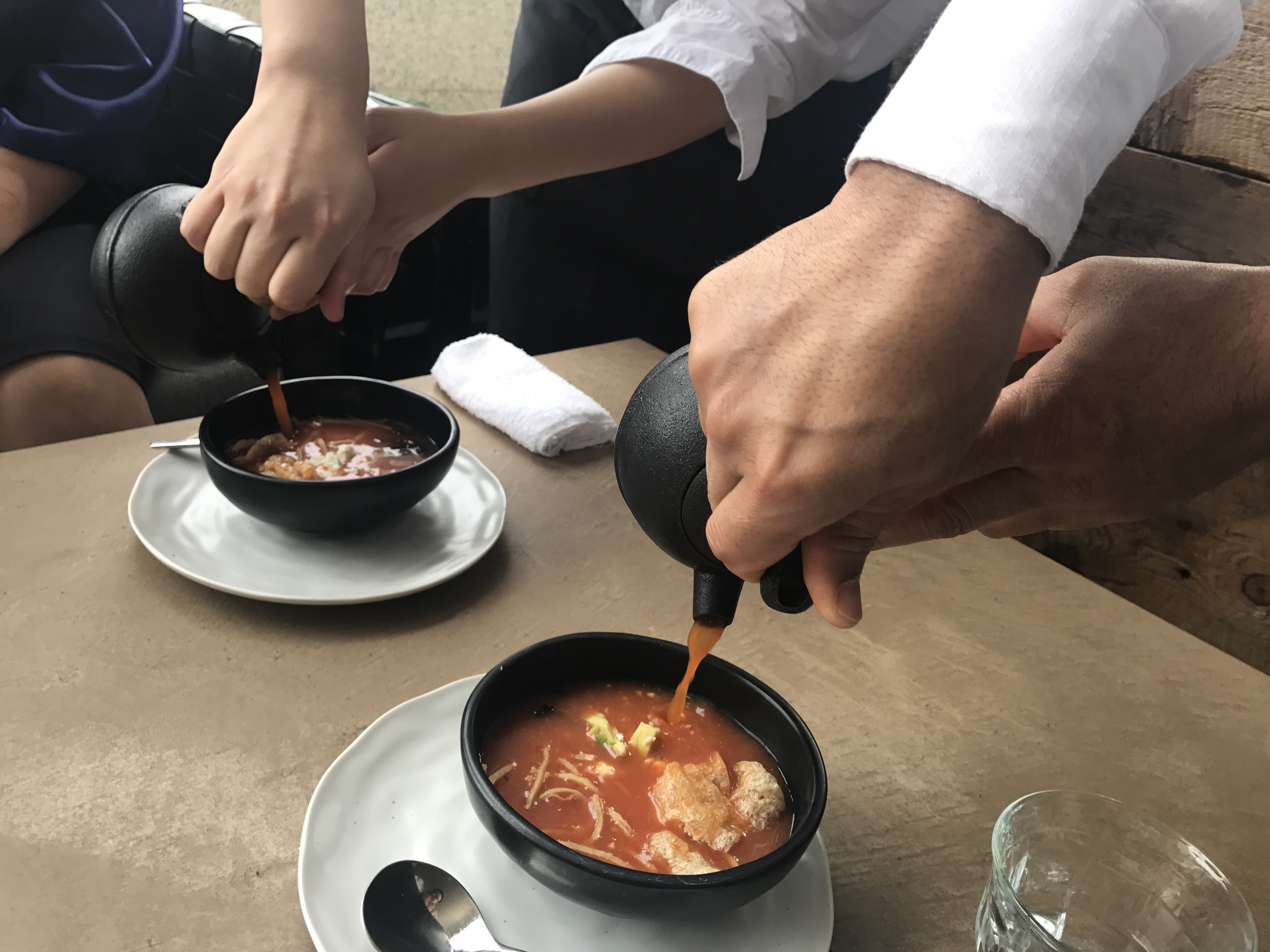 最初のスープは2人でサービスしてくれます。トルティーヤスープといって、細切りにしたトルティーヤに、チチャロンというカリカリに揚げたせんべいのような豚の皮が入っています(フィリピンにも同じものがあるのでビックリ)