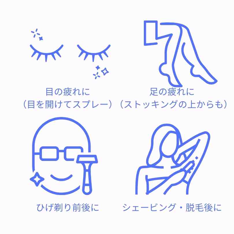 - 疲れた足に:スプレー後、しばらくすると軽やかに。