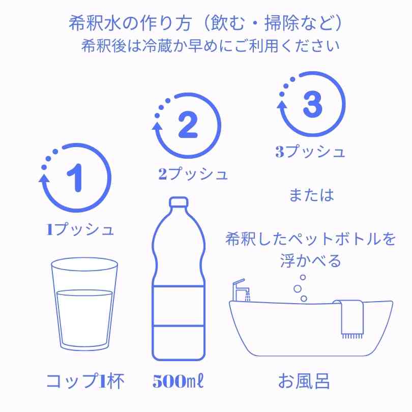 飲用や食品へのスプレー、希釈してのご利用(掃除・空間ミストなど)は、なるべく早めにお使い切りください。