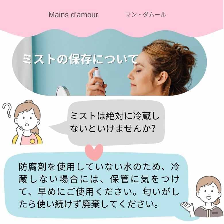 そのため、開封後は冷蔵保存が望ましいですが、30mlや150mlのスプレー容器を清潔に保っていれば、常温でも問題なくご使用いただけます。